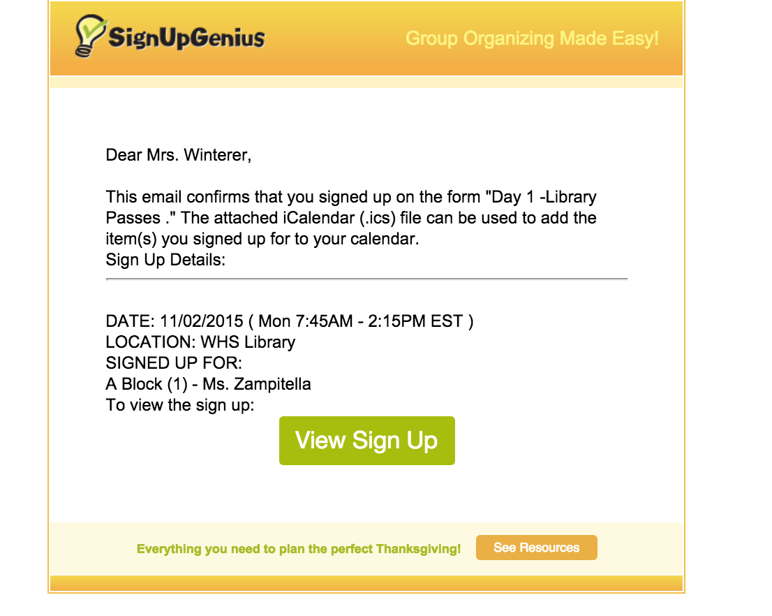 WHS is moving to electronic library passes. To get a library pass students need to go to whslearningcommons.com to sign up. The passes will be open to sign up after 8pm the night before the study hall. Students will receive a confirmation email that they will show to their study hall teachers before coming to the library. The confirmation email should look like this: